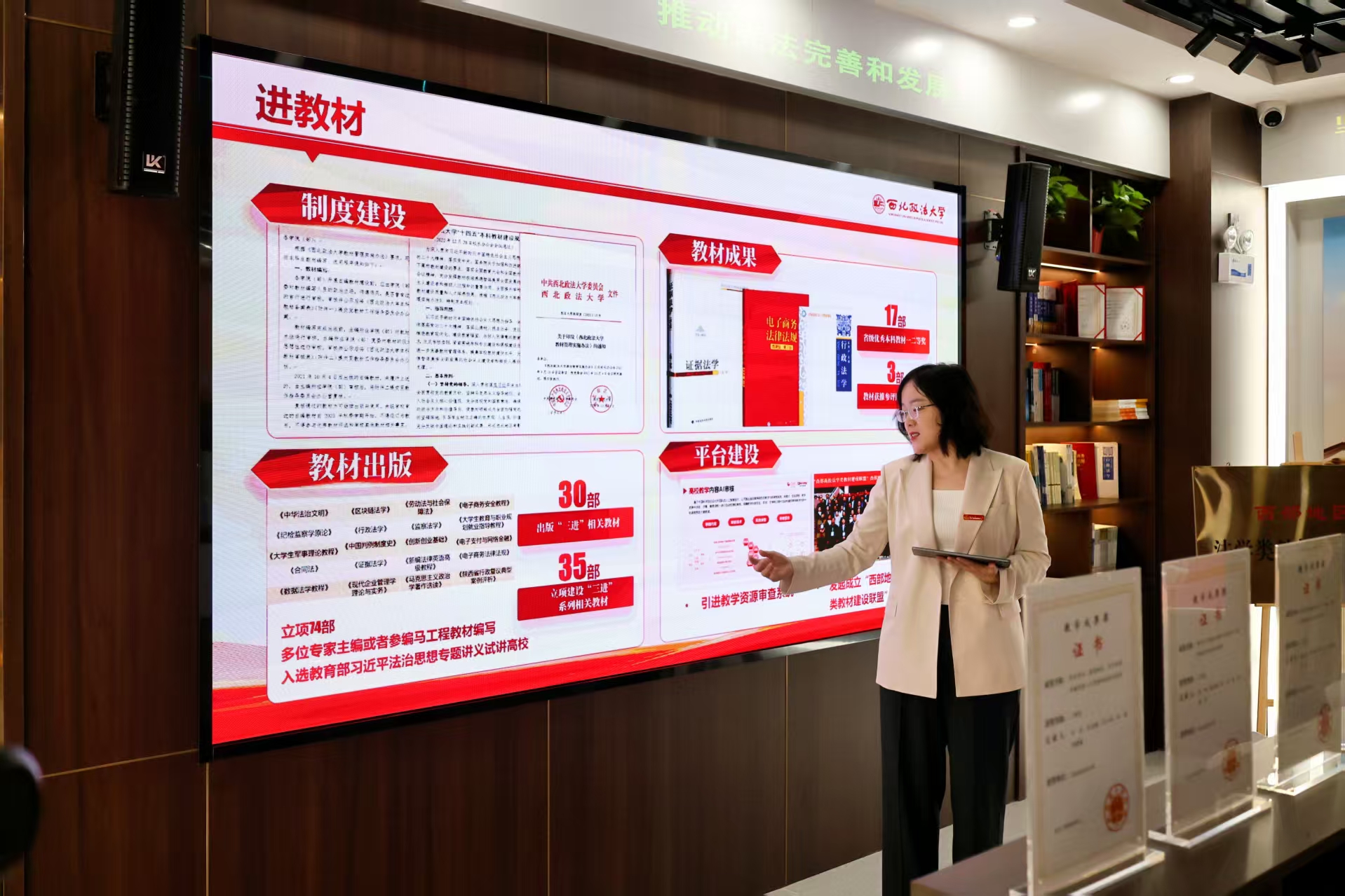 9月27日,我校習近平法治思想“三進”成果展室正式揭牌投入使用,這是我校深入貫徹落實習近平法治思想、踐行立德樹人根本任務的重要舉措。展室以“理論溯源-核心要義-實踐舉措”為敘事主線,由“習近平法治思想形成發展脈絡展區”“習近平法治思想核心要義解讀專區”“西北政法大學‘三進’成果展示專區”三大核心板塊有機組成,借助圖文展陳、實物陳列與數字化技術,全方位、多層次地呈現出學校在推動習近平法治思想“進教材、進課堂、進頭腦”方面取得的豐碩成果與育人成效。