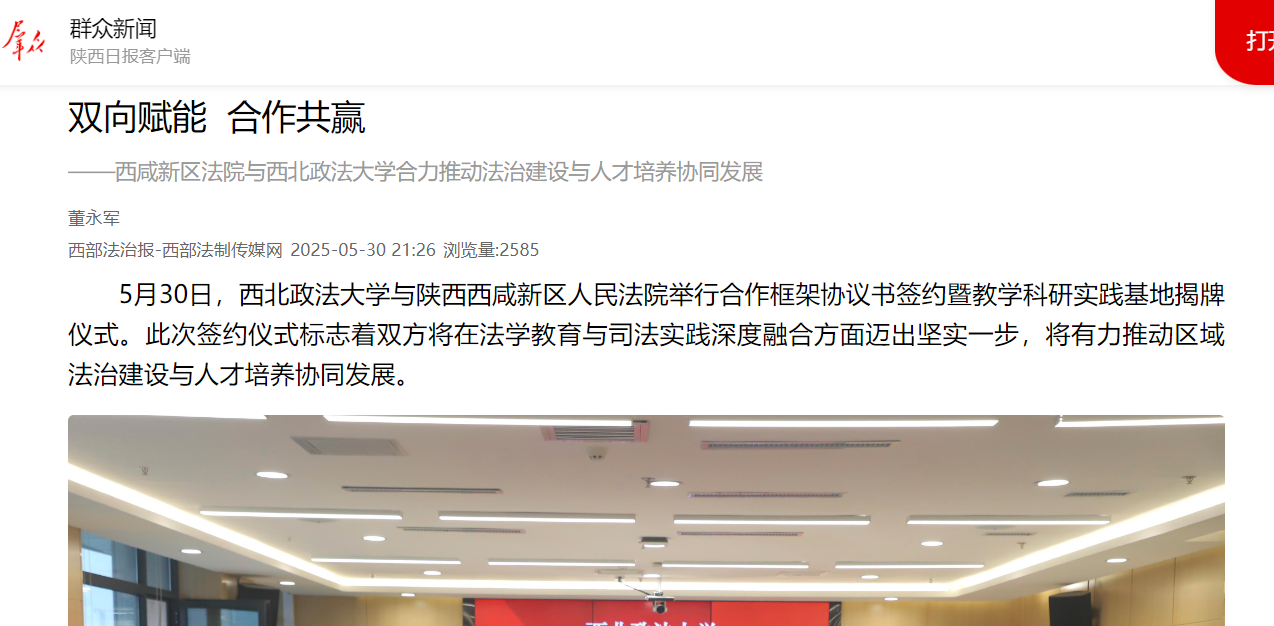 【群眾新聞】雙向賦能 合作共贏——西咸新區法院與西北政法大學合力推動法治建設與人才培養協同發展https://xzzsx.sxdaily.com.cn/app/template/displayTemplate/news/newsDetail/9311/11196336.html?isShare=true