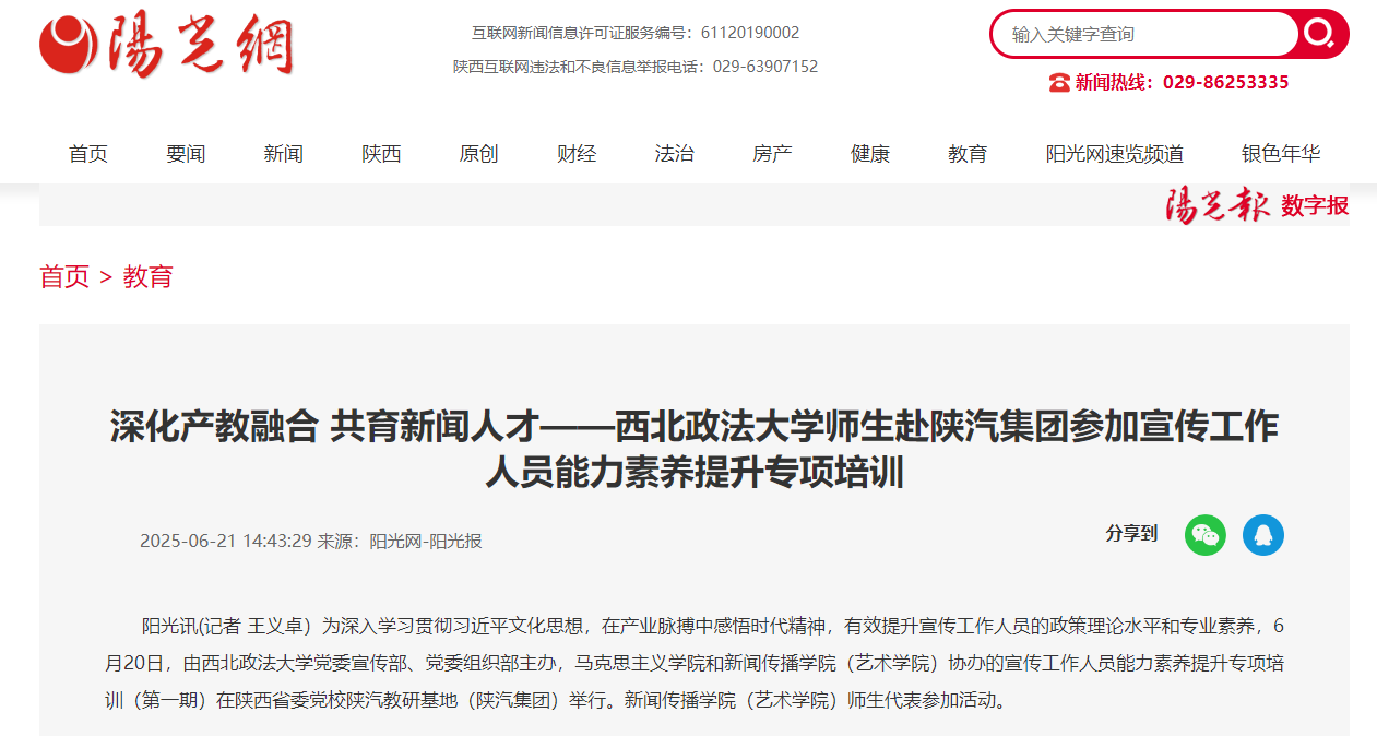 【陽光報陽光網】深化產教融合 共育新聞人才——西北政法大學師生赴陜汽集團參加宣傳工作人員能力素養(yǎng)提升專項培訓 https://www.toutiao.com/article/7518292192126632475/?share_did=MS4wLjACAAAArivRSXIEA_g7yTfk1zcIchaWJYIzzmzbXeBnNcWF6gI9rsftwNR1AkIll8xtBQ8E&category_new=profile_search&app=news_article&share_uid=MS4wLjABAAAApp9OdTiXoPAJwOzdVXMMcfDDW634GA_tsdRtYKLJc6U&upstream_biz=client_share×tamp=1750684117&share_token=4c7f3c9a-37fc-4a54-8321-7a5e6d4ac3c1&source=m_redirect&wid=1750728698215
