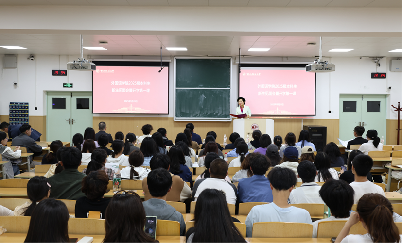 9月28日,外國語學院2025級本科生新生見面會暨開學第一課在天平樓AJ31舉行。學院黨政領導班子成員、教師代表、輔導員以及全體2025級本科新生參加了本次活動。活動由學院黨委副書記、副院長劉瑾主持。