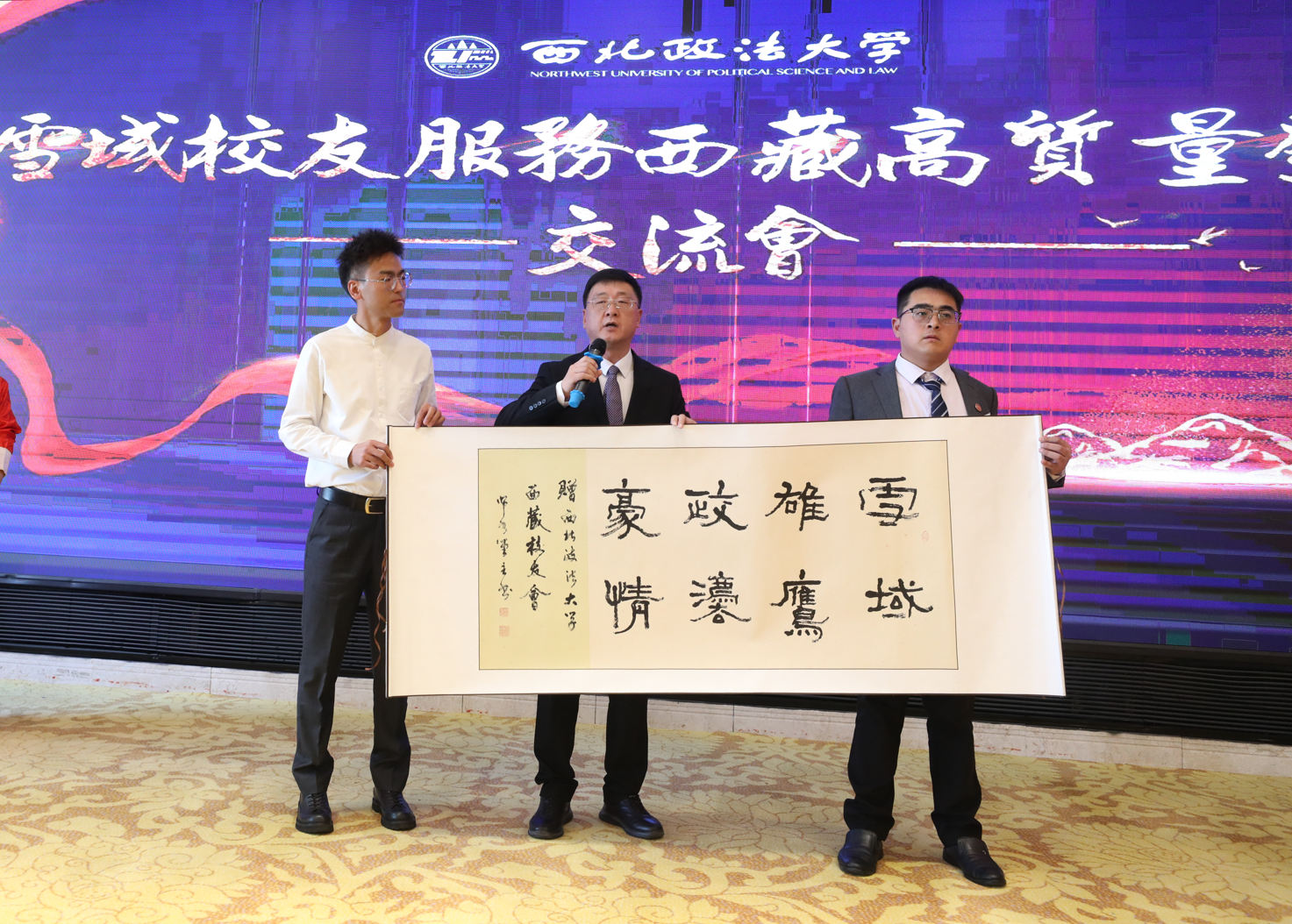 國內(nèi)合作與校友工作處處長、校友總會秘書長劉霖杰宣讀《關(guān)于西北政法大學(xué)西藏校友理事會換屆工作的批復(fù)》,并代表學(xué)校向西藏校友會贈送由姚喜平教授專門創(chuàng)作的書法作品。