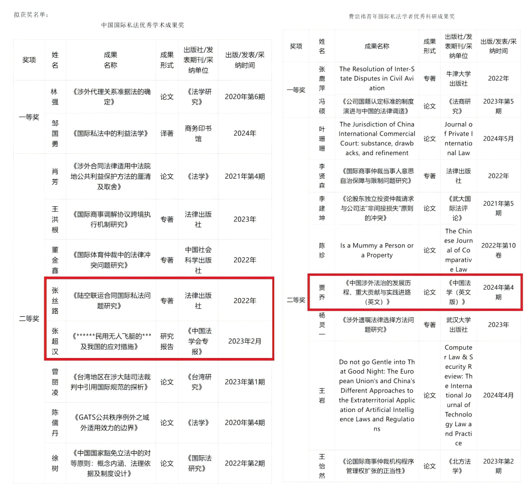 “中國國際私法優秀學術成果獎”“費宗祎青年國際私法學者優秀科研成果獎”是中國國際私法學會為提升國際私法研究的質量和水平,推動和促進我國國際私法學的可持續發展所設立的獎項。該獎項是中國國際私法學界對國際私法學者所設最高獎項,旨在表彰具有重大理論價值和實踐意義的原創性科研成果。2024年經評審確定“中國國際私法優秀學術成果獎”作品10件,其中一等獎2項,二等獎8項;“費宗祎青年國際私法學者優秀科研成果獎”作品10件,其中一等獎2項,二等獎8項。