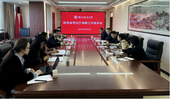 陜西省司法廳二級巡視員、陜西省調解協會副會長馬異文,陜西省司法廳人民參與和促進法治處二級調研員、陜西省調解協會秘書長劉美琳,陜西省司法廳人民參與和促進法治處二級調研員張建利陪同調研。科研處、調解研究院、民商法學院、行政法學院、商學院等單位負責人及專家學者參加座談。